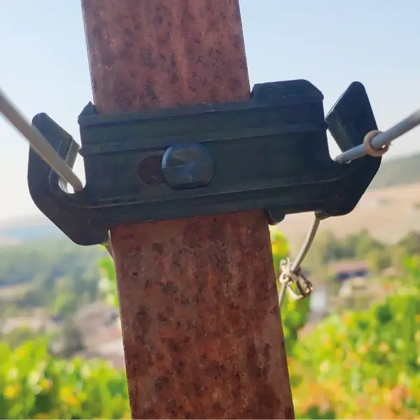 Keepfil cornière est la barrette porte-fil à pose rapide pour les piquets cornières. Elle convient pour le palissage avec tous les types de fils, métal ou plastique, fils releveurs ou fils fixes. Le support de fil s’installe en quelques secondes et sans outil grâce à son Fentio et son Bloksert. C’est aussi une solution idéale pour remiser vos fils en bas du piquet en hiver. Les Keepfil cornière sont 100% fabriqués en France.